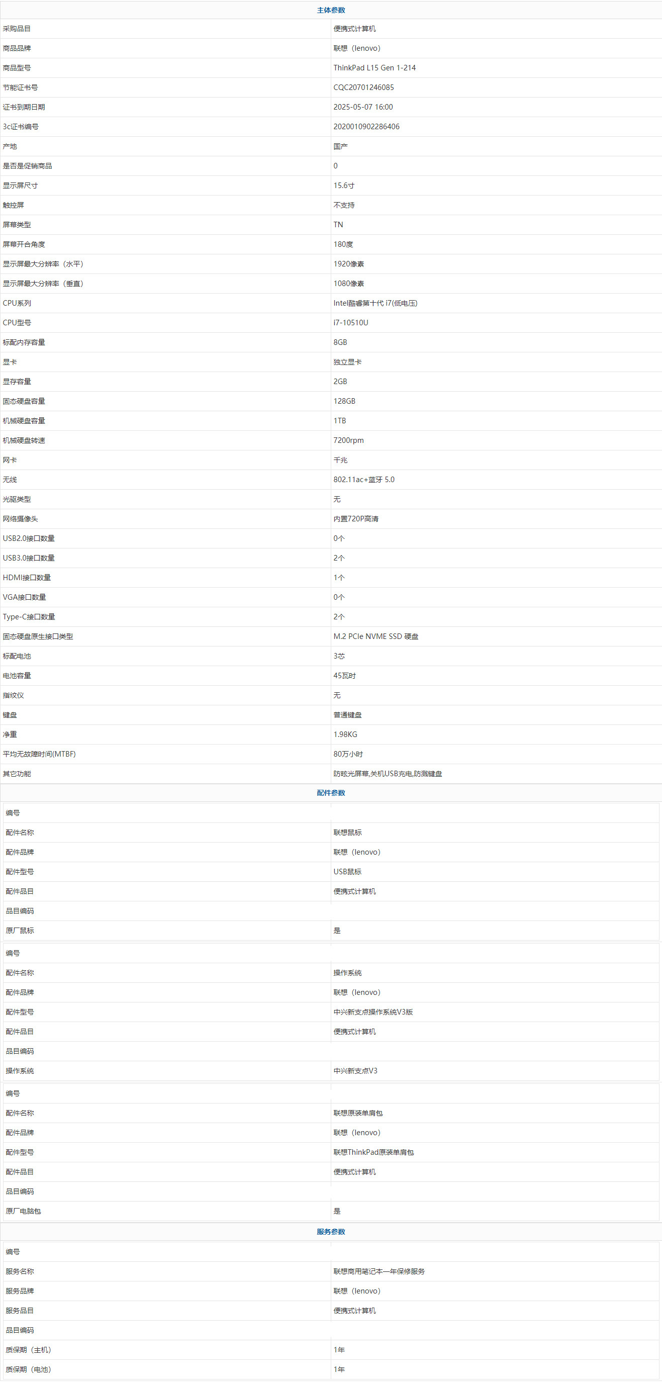 - 商品名稱:聯(lián)想(lenovo) ThinkPad L15 Gen 1-214 Intel酷睿第十代 i7(低電壓) i7-10510U 8GB 1TB 128GB 中興新支點(diǎn)V3 15.6寸 1年