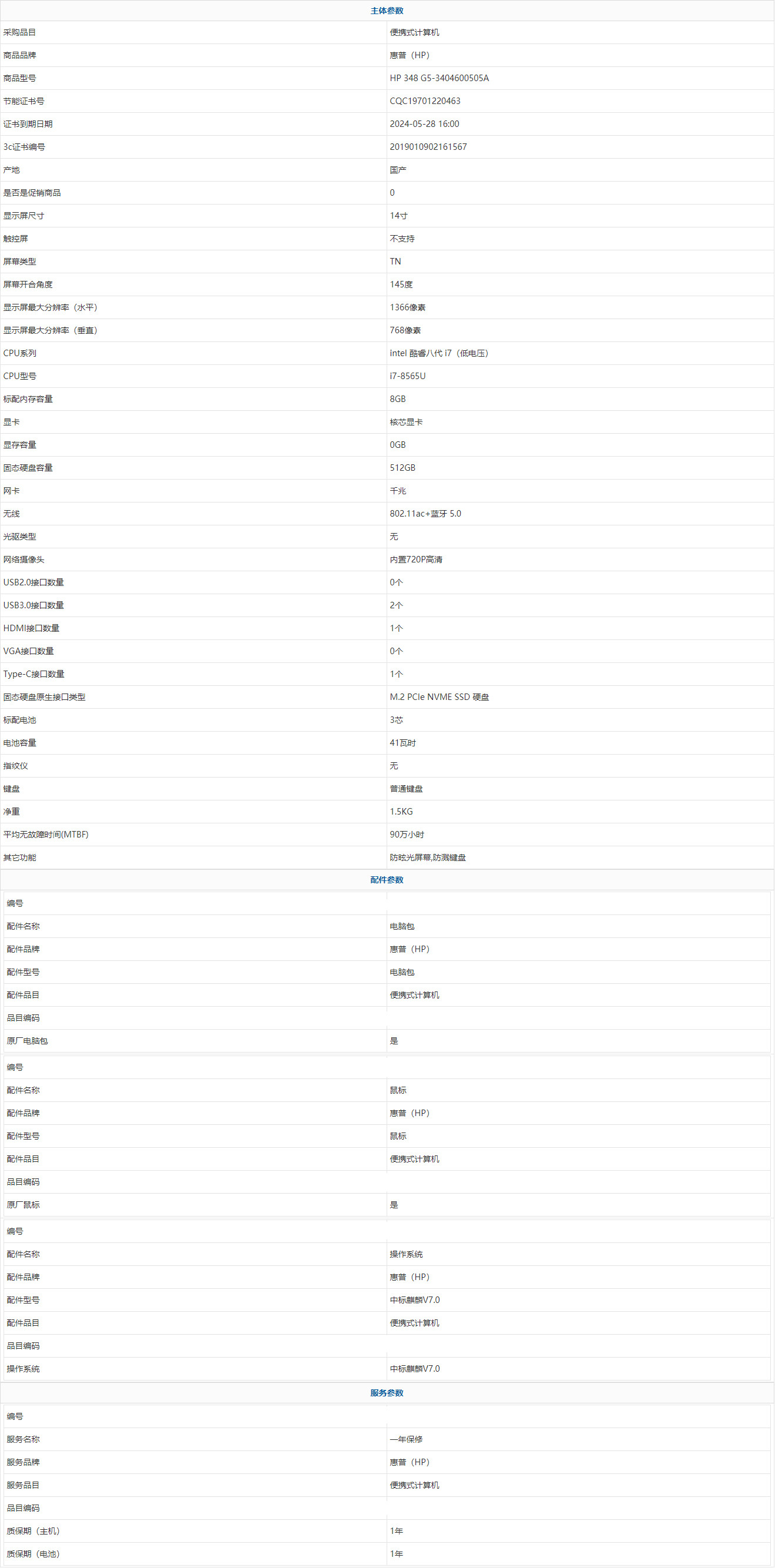 - 商品名稱:惠普(HP) HP 348 G5-3404600505A intel 酷睿八代 i7(低電壓) i7-8565U 8GB 512GB 中標(biāo)麒麟V7.0 14寸 1年