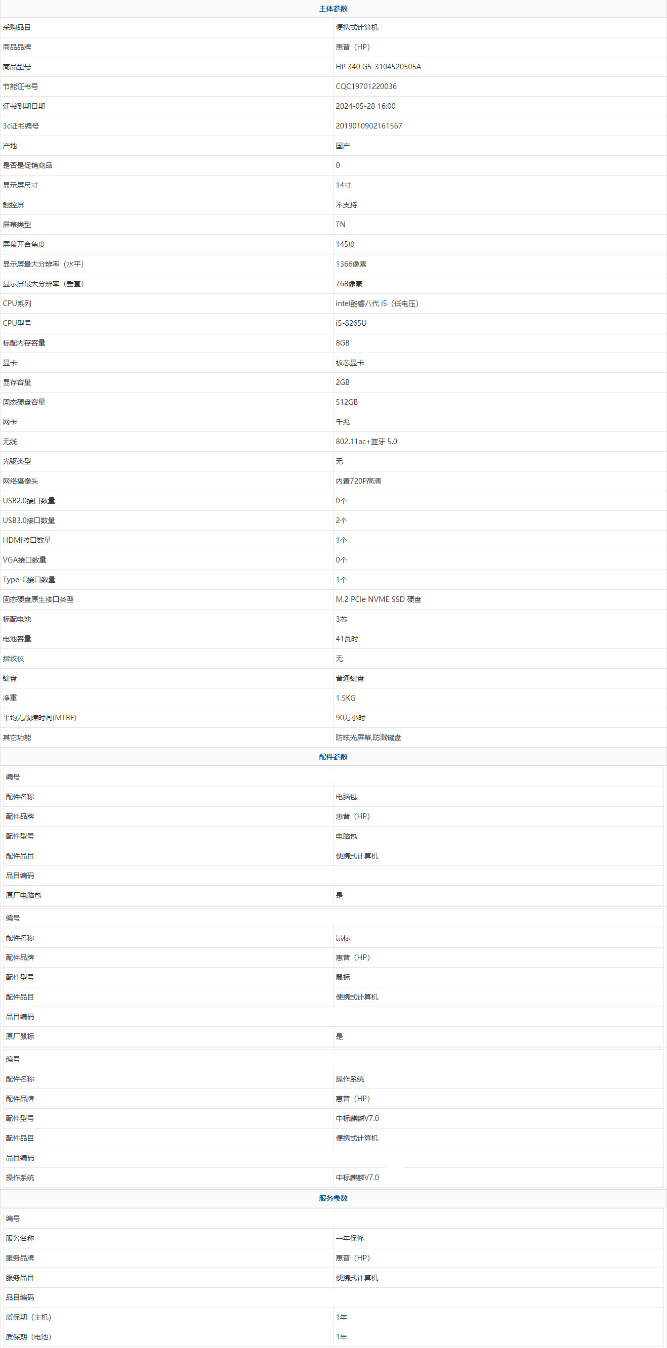 - 商品名稱:惠普(HP) HP 340 G5-3104520505A intel酷睿八代 i5(低電壓) i5-8265U 8GB 512GB 中標(biāo)麒麟V7.0 14寸 1年