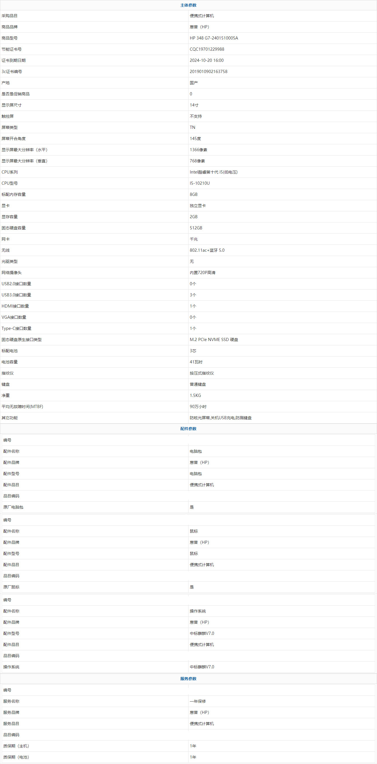 • 商品名稱:惠普(HP) HP 348 G7-2401510005A Intel酷睿第十代 i5(低電壓) I5-10210U 8GB 512GB 中標(biāo)麒麟V7.0 14寸 1年