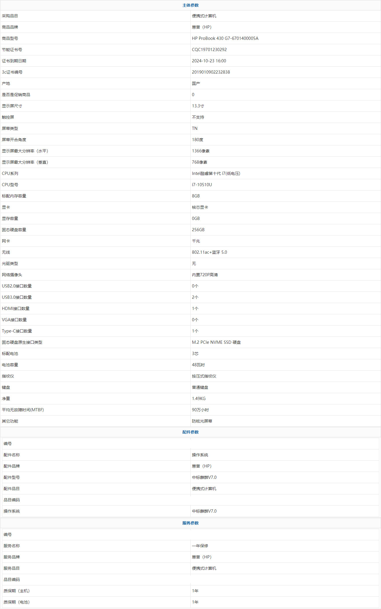 - 商品名稱:惠普(HP) HP ProBook 430 G7-6701400005A Intel酷睿第十代 i7(低電壓) i7-10510U 8GB 256GB 中標(biāo)麒麟V7.0 13.3寸 1年