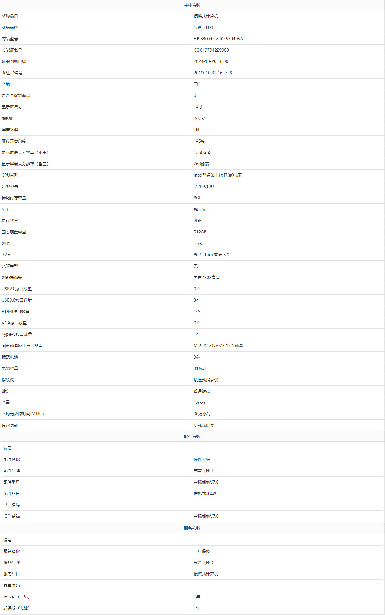 - 商品名稱:惠普(HP) HP 340 G7-8402520405A Intel酷睿第十代 i7(低電壓) i7-10510U 8GB 512GB 中標(biāo)麒麟V7.0 14寸 1年
