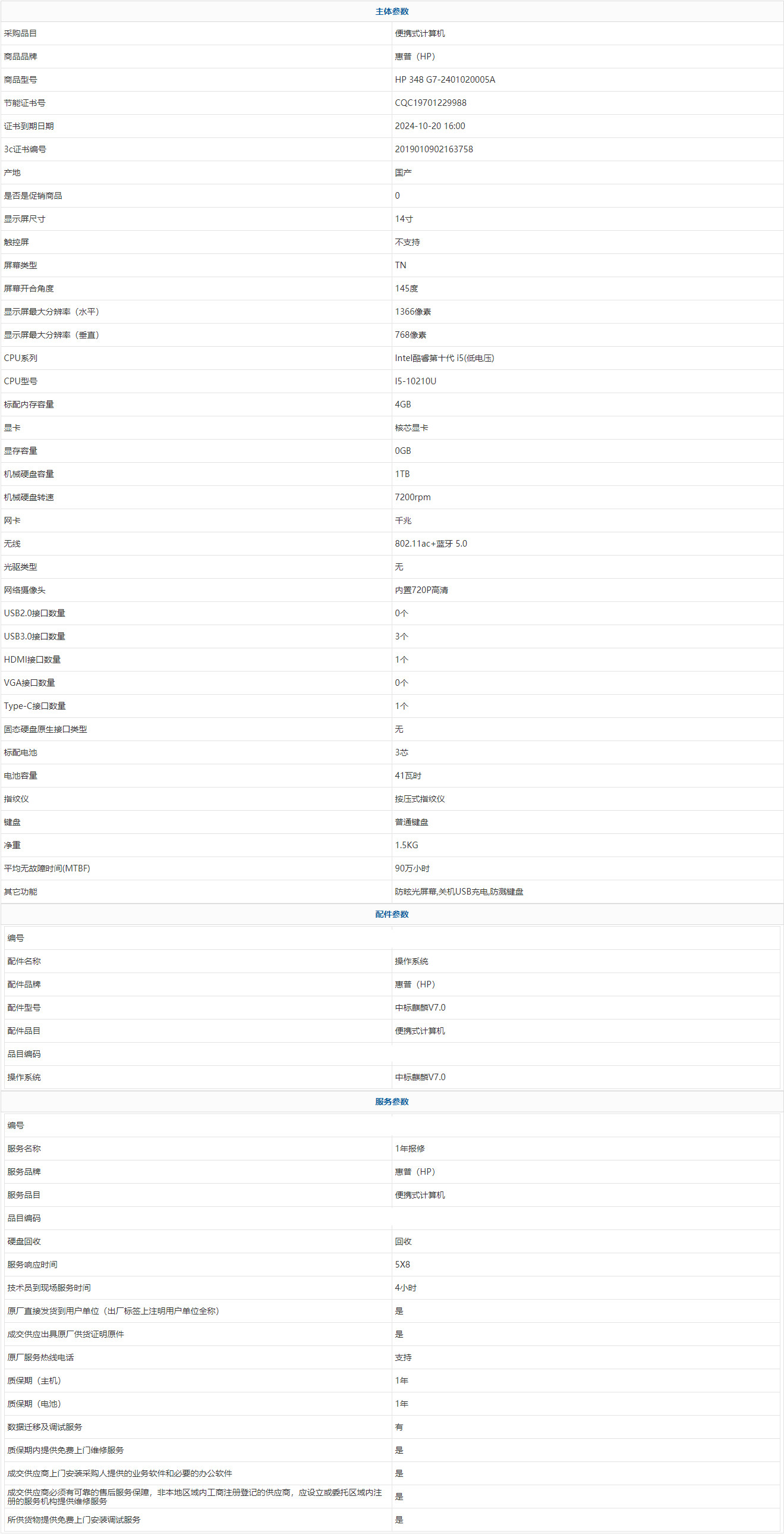 • 商品名稱:惠普(HP) HP 348 G7-2401020005A Intel酷睿第十代 i5(低電壓) I5-10210U 4GB 1TB 中標(biāo)麒麟V7.0 14寸 1年