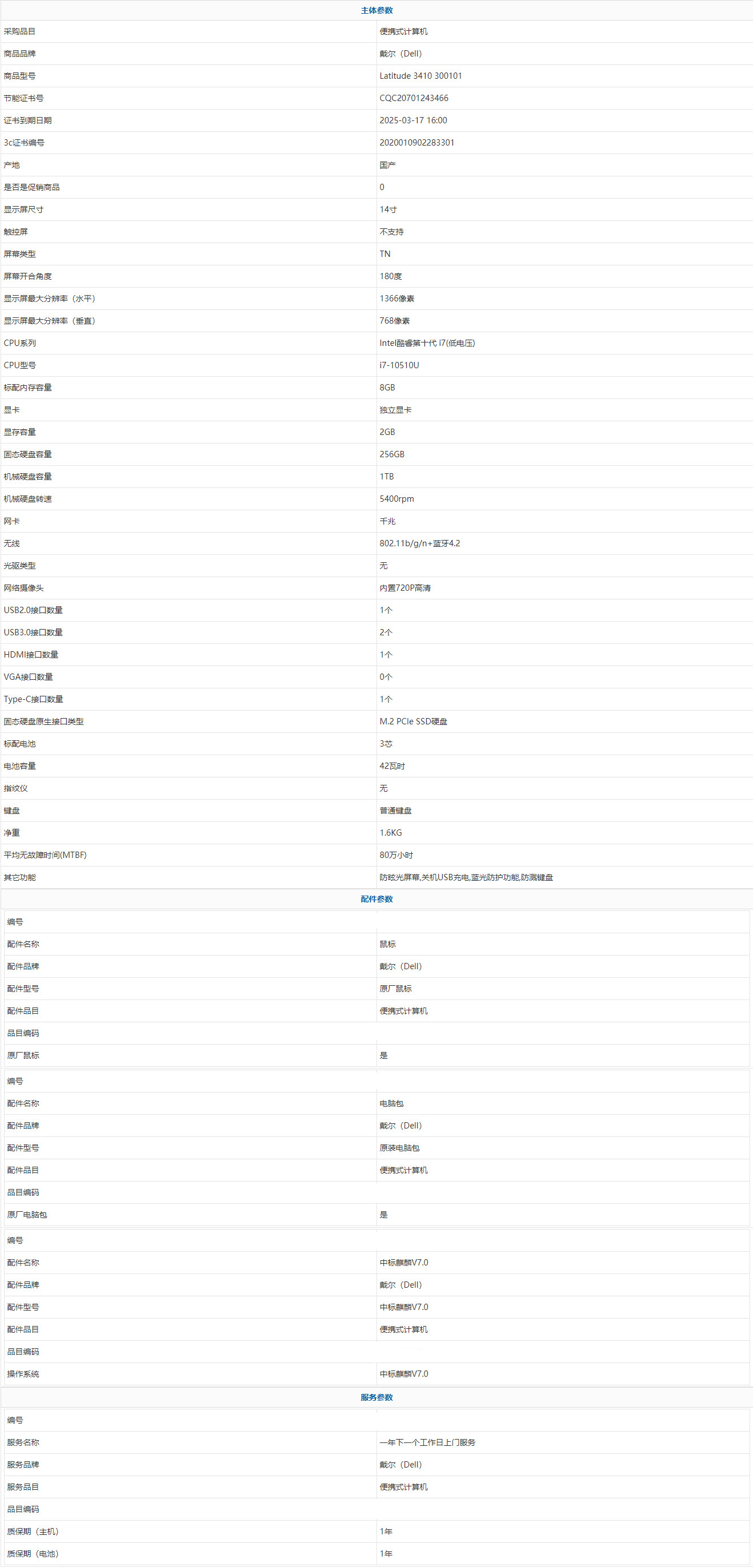 • 商品名稱:戴爾(Dell) Latitude 3410 300101 Intel酷睿第十代 i7(低電壓) i7-10510U 8GB 1TB 256GB 中標(biāo)麒麟V7.0 14寸 1年