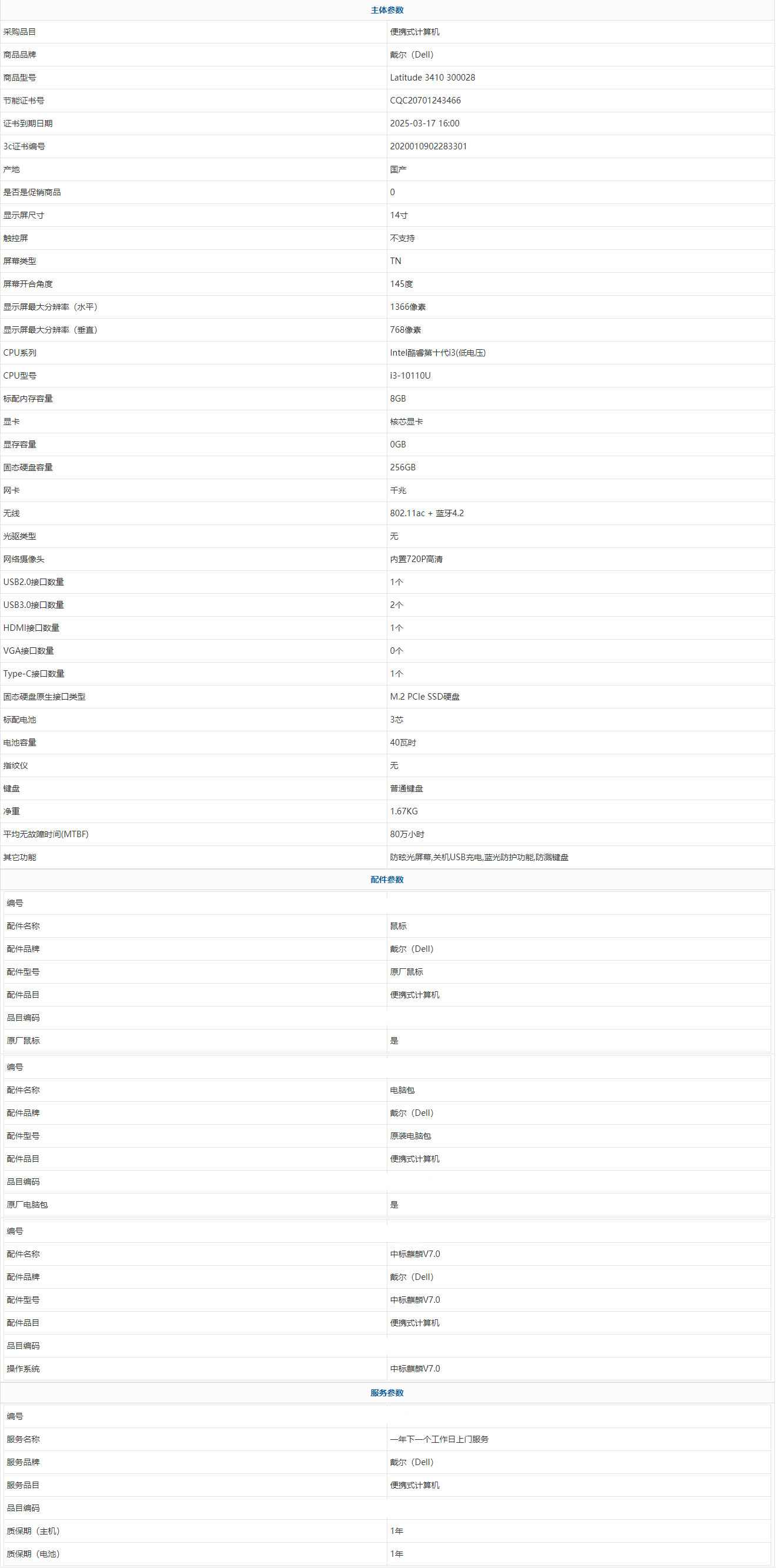 • 商品名稱:戴爾(Dell) Latitude 3410 300028 Intel酷睿第十代i3(低電壓) i3-10110U 8GB 256GB 中標麒麟V7.0 14寸 1年