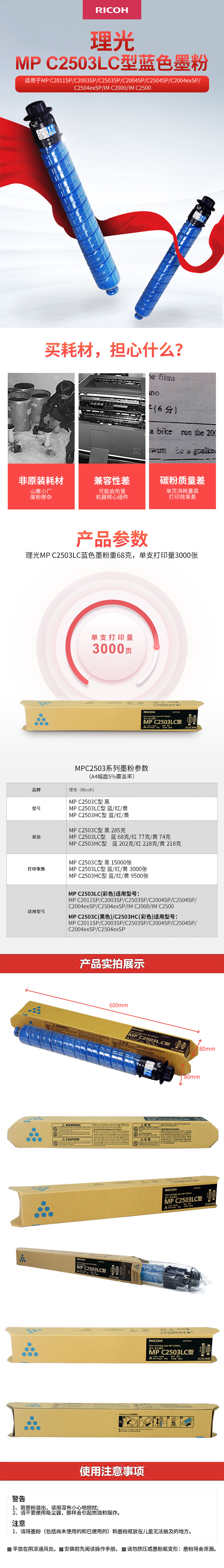 • 商品名稱:理光(RICOH)MPC2503LC型藍(lán)色碳粉盒 印量約3000頁