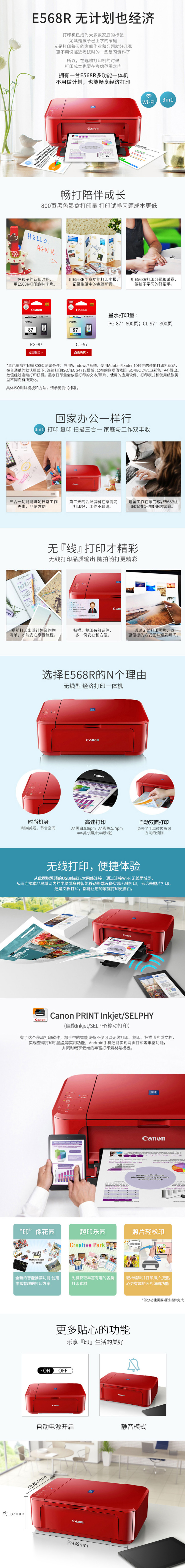 - 商品名稱(chēng):佳能(Canon)E568R A4彩色噴墨打印機(jī) 打印/復(fù)印/掃描 無(wú)線(xiàn)連接 自動(dòng)雙面 適用耗材:PG-87/CL-97