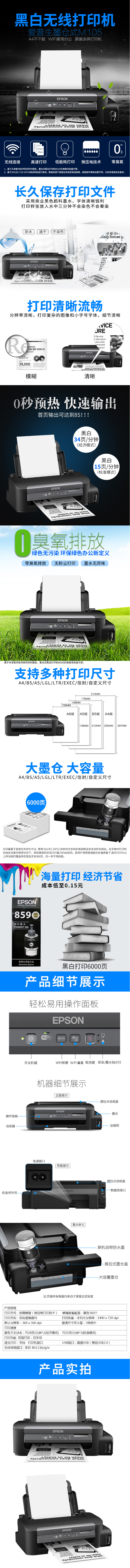 - 商品名稱:愛(ài)普生(Epson)M105 A4黑白無(wú)線打印機(jī) 墨倉(cāng)式 無(wú)線/USB連接 官方標(biāo)配 黑色 適用耗材:859墨水