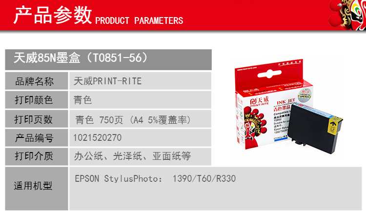 • 商品名稱(chēng):天威 T0852 墨盒專(zhuān)業(yè)裝 750頁(yè) 青色 適用于EPSONStylusPhoto1390/T60/R330