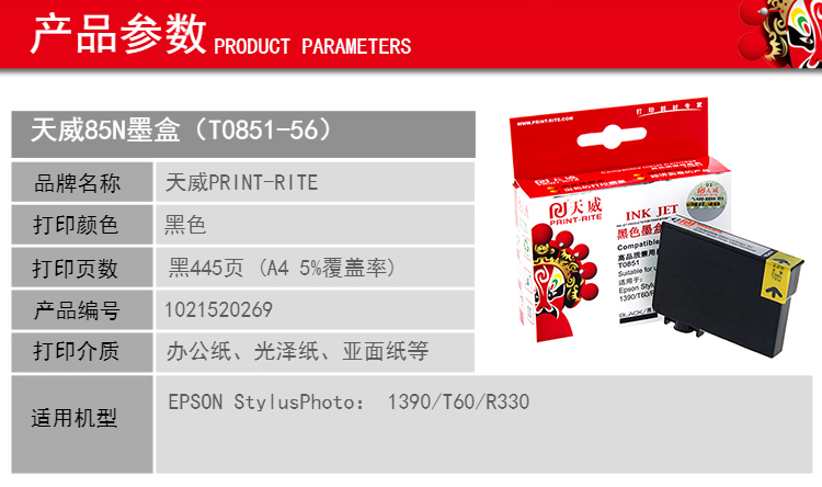 天威 T0851 墨盒專業(yè)裝 445頁 黑色 適用于EPSONStylusPhoto1390/T60/R330