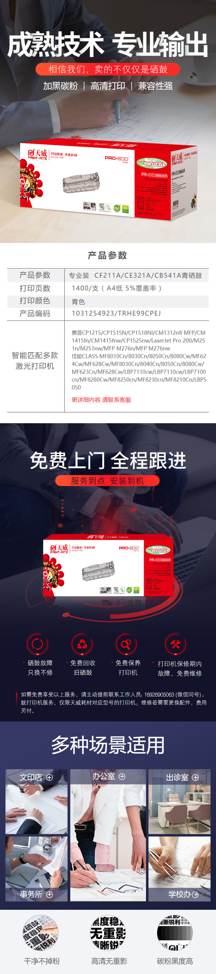 天威 CB541A 硒鼓帶芯片商用裝(TRH826CPSYJ) 1400頁 青色 / 適用于HP Color LaserJet CP1210/CP1215/CP1510/CP1515/CP1518/CM1312MFP Canon Laser Shot LBP5050/5050n, Canon MF8040/MF8050