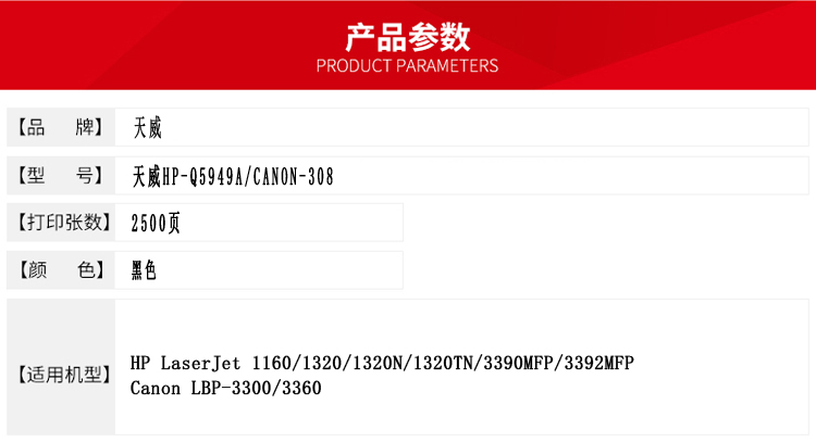 - 商品名稱:天威 Q5949A 硒鼓新版專業(yè)裝(TFH082BPEJ) 2500頁(yè) 黑色 / 適用于HP LaserJet 1160/1160le/1320/1320n/1320nw/1320t/1320tn/3390MFP/3392MFP; Canon LBP-3300/3360.
