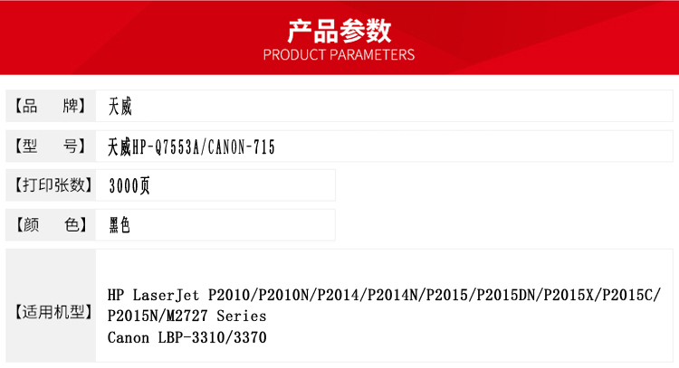 - 商品名稱:天威 Q7553A 硒鼓帶芯片-新版專業(yè)裝(TFH083BPEJ) 3000頁(yè) 黑色 / 適用于HP LaserJet M2727nf/M2727nfs/P2010/P2010n/P2014/P2014n/P2015/P2015A/P2015dn/P2015n/P2015x; Canon LBP-3310/3370; Troy Systems Micr 2015.