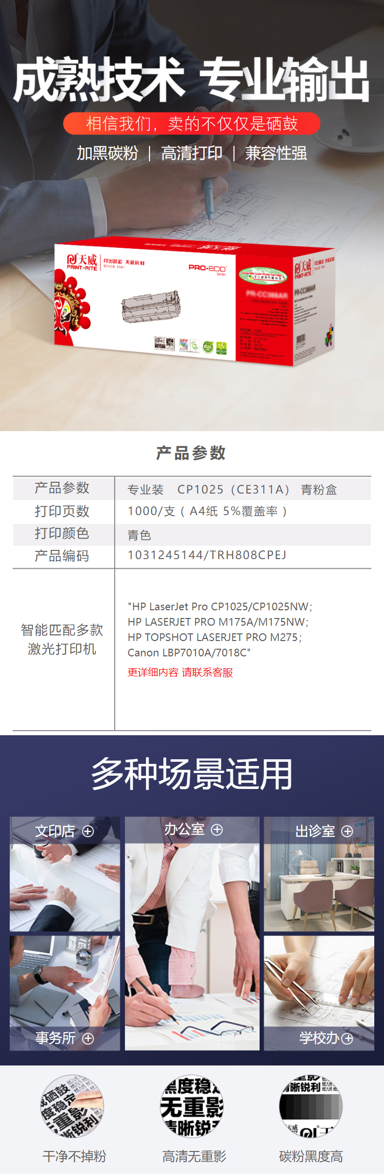 天威 CE311A 粉盒帶芯片專業(yè)裝(TRH808CPEJ) 1000頁 青色 / 適用于HP LaserJet Pro CP1025/CP1025NW; HP LASERJET PRO M175A/M175NW; HP TOPSHOT LASERJET PRO M275; Canon LBP7010A/7018C