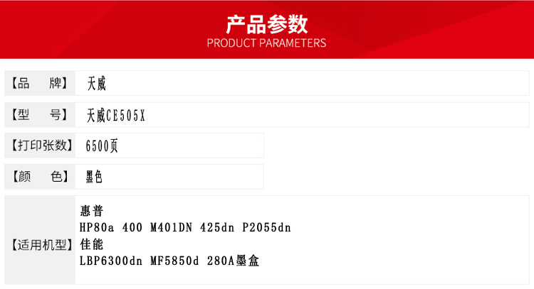 • 商品名稱:天威 CE505X 硒鼓帶芯片-新版專業(yè)裝(TFH049BPEJ) 6500頁 黑色 / 適用于HP LaserJet P2050 series/P2055/P2055A/P2055dn/P2055x, Canon i-SENSYS LBP6680x/MF5840dn/MF5880dn/LBP6650dn/LBP6300dn/MF5940dn/MF5980dw/LBP6670dn/ LBP631