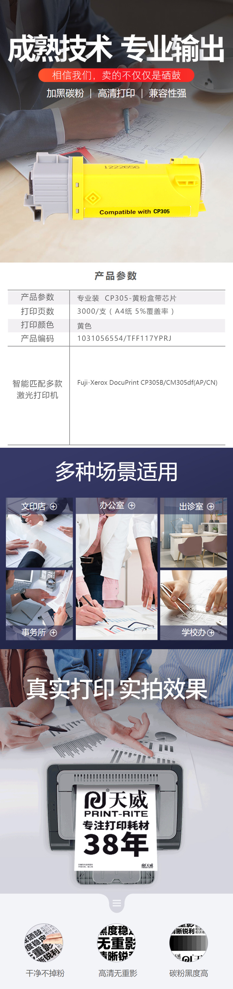 天威 CP305 粉盒帶芯片專(zhuān)業(yè)裝(TFF117YPRJ) 3000頁(yè) 黃色 / 適用于Fuji-Xerox DocuPrint CP305B/CM305df(AP/CN)