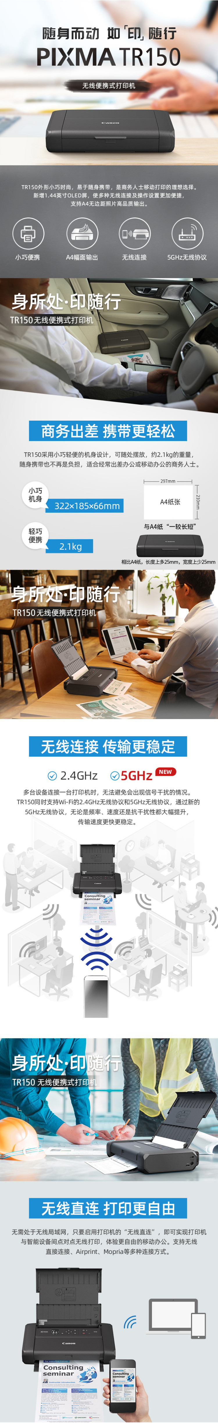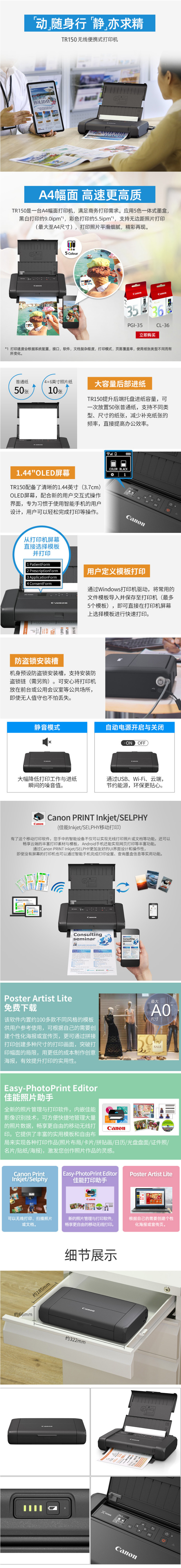 • 商品名稱:佳能(Canon) 騰彩PIXMA TR150無線便攜式打印機(jī) A4幅面 無線打印 黑色 適用耗材:PGI-35/CL-36