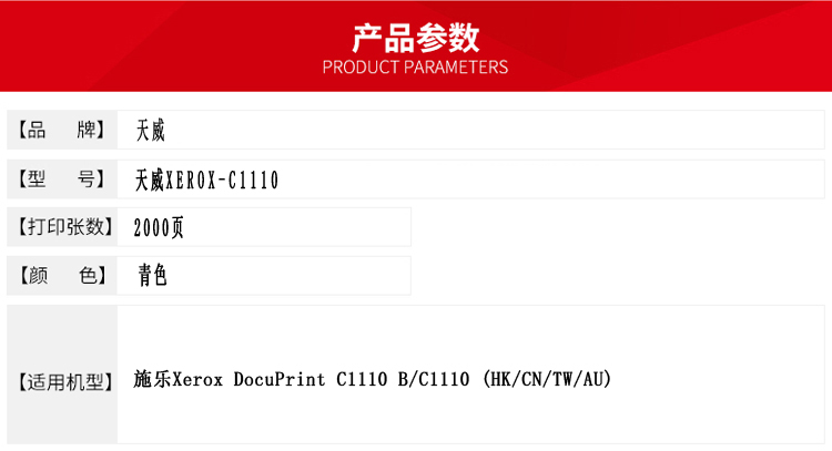 • 商品名稱:天威 C1110C 粉盒帶芯片-新版專業(yè)裝(TFX256CPRJ) 2000頁 青色 / 適用于Fuji-Xerox DocuPrint C1110 B/C1110 (HK/CN/TW/AU)