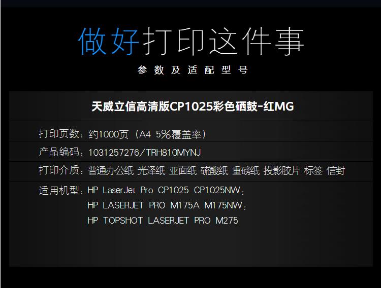立信 CE313A 粉盒帶芯片天威立信(TRH810MYNJ) 1000頁 洋紅色 / 適用于HP LaserJet Pro CP1025/CP1025NW; HP LASERJET PRO M175A1/M175NW; HP TOPSHOT LASERJET PRO M275; Canon LBP7010A1/7018C