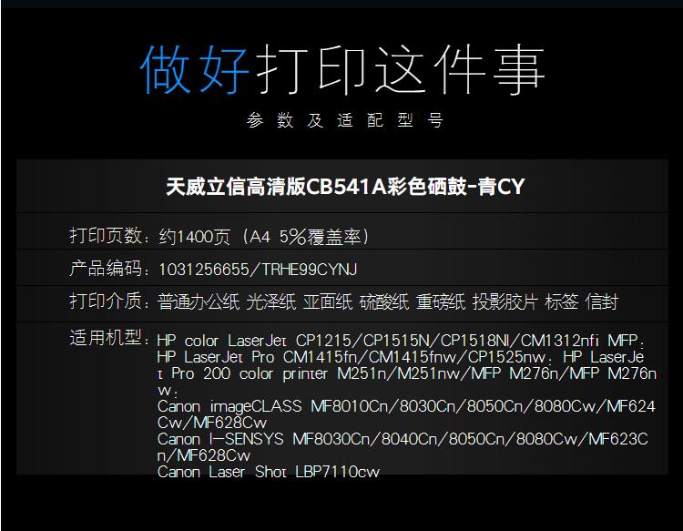 立信 CB541A 硒鼓帶芯片天威立信(TRHE99CYNJ) 1400頁(yè) 青色 / 適用于HP color LaserJet CP1215/CP1515N/CP1518NI/CM1312nfi MFP; HP LaserJet Pro CM1415fn/CM1415fnw/CP1525nw; HP LaserJet Pro 200 color printer M251n/M251nw/MFP