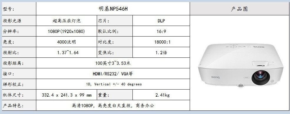 - 商品名稱:明基(BenQ) NP546H投影儀 4000流明 全高清1080P 分辨率1920*1080 DLP技術(shù)