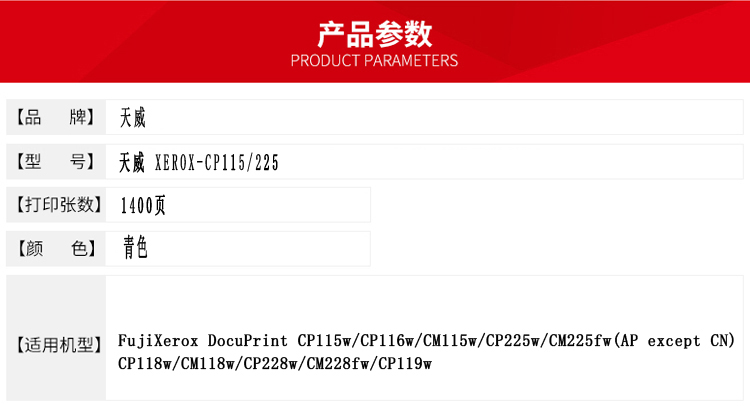 天威 CP115/225 粉盒帶芯片專業(yè)裝(TFF161CPRJ) 1400頁 青色 / 適用于FujiXerox DocuPrint CP115w/CP116w/CM115w/CP225w/CM225fw(AP except CN)CP118w/CM118w/CP228w/CM228fw/CP119w