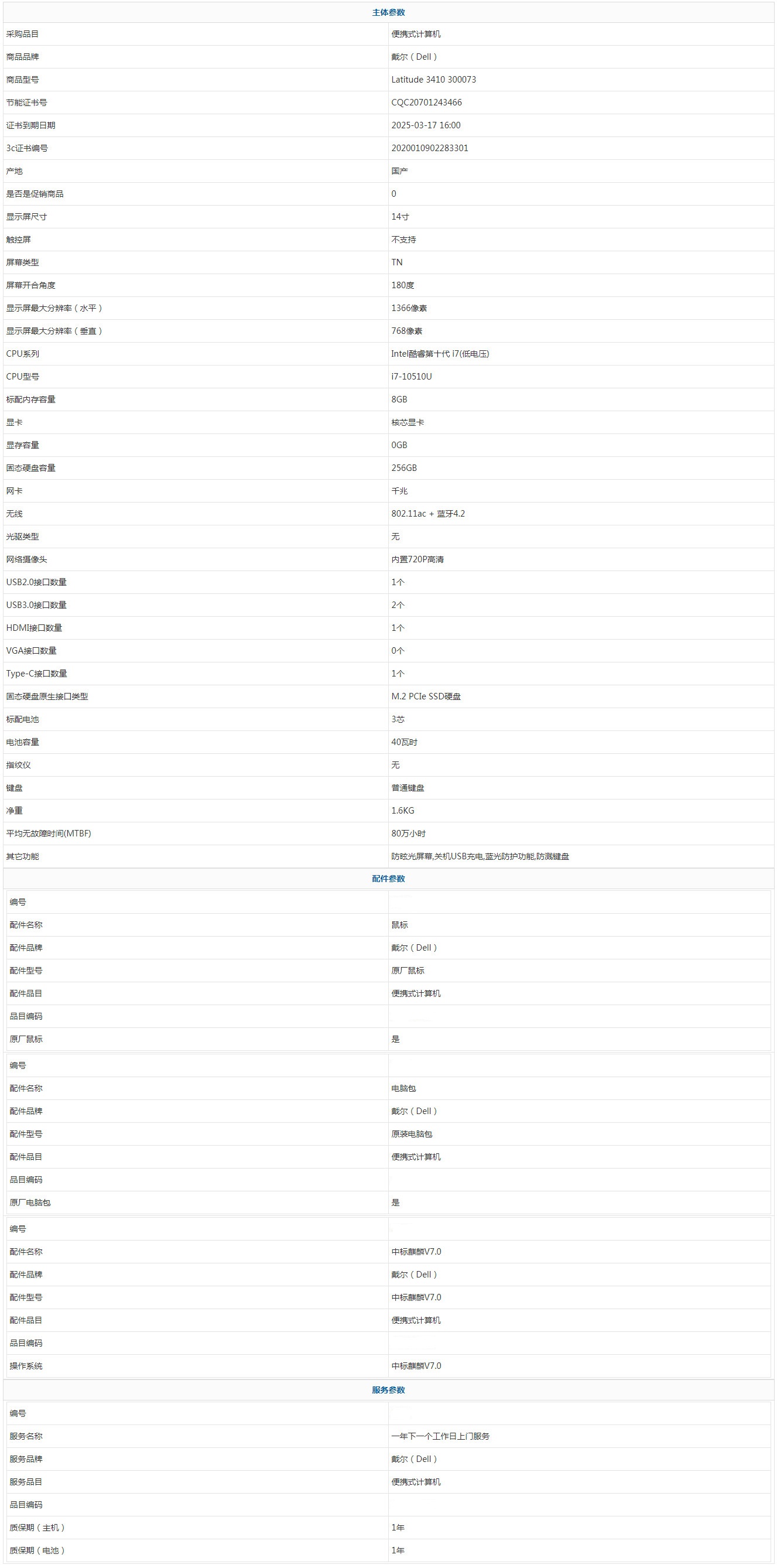 - 商品名稱:戴爾(Dell) Latitude 3410 300073 Intel酷睿第十代 i7(低電壓) i7-10510U 8GB 256GB 中標(biāo)麒麟V7.0 14寸 1年