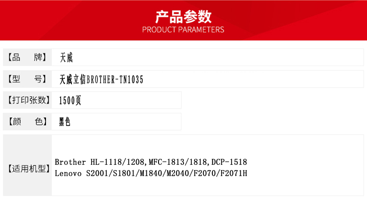 立信 TN1035 粉盒天威立信裝(TFB292BYNJ) 1500頁 黑色 適用于Brother HL-1118/1208,MFC-1813/1818,DCP-1518 Lenovo S2001/S1801/M1840/M2040/F2070/F2071H