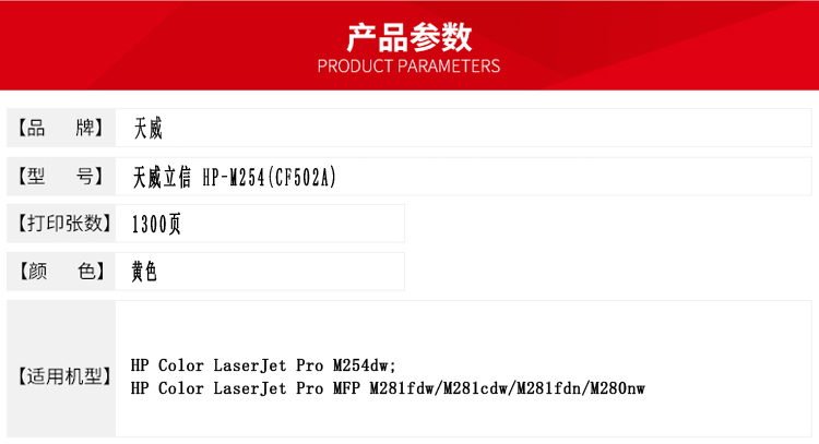 • 商品名稱:立信 CF502A 硒鼓帶芯片天威立信裝(TFH316YYNJ) 1300頁 黃色 適用于HP Color LaserJet Pro M254dw; HP Color LaserJet Pro MFP M281fdw/M281cdw/M281fdn/M280nw