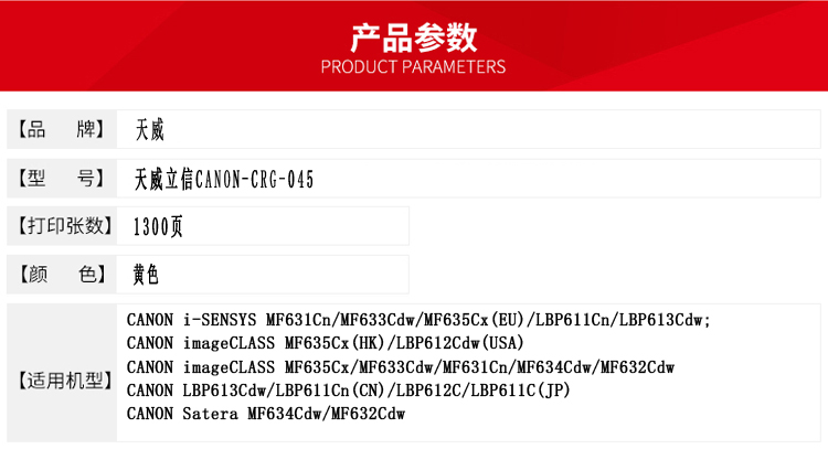 - 商品名稱:立信 CRG-045 硒鼓帶芯片天威立信裝(TFC242BYNJ) 1400頁 黑色 適用于CANON i-SENSYS LBP611Cn/LBP613Cdw; CANON i-SENSYS MF631Cn/MF633Cdw/MF635Cx(EU) CANON imageCLASS MF634Cdw/MF632Cdw CANON imageCLASS LBP612Cdw(USA) CANON im
