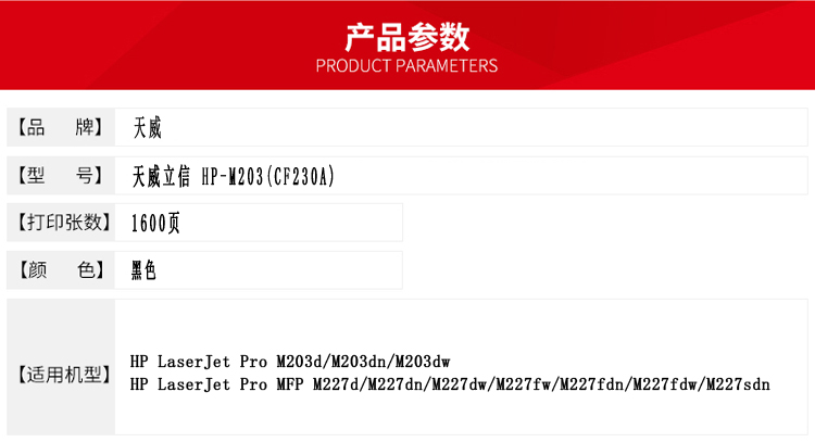 商品名稱:立信 CF230A 粉盒帶芯片天威立信裝(TFH242BYNJ) 1600頁(yè) 黑色 適用于HP LaserJet Pro M203d/M203dn/M203dw HP LaserJet Pro MFP M227d/M227dn/M227dw/M227fw/M227fdn/M227fdw/M227sdn