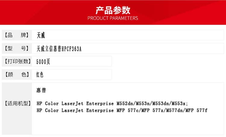 - 商品名稱:立信 CF363 硒鼓帶芯片天威立信裝(TFH344MYNJ) 5000頁 洋紅色 適用于HP Color LaserJet Enterprise M552dn/M553n/M553dn/M553x; HP Color LaserJet Enterprise MFP 577c/MFP 577z/M577dn/MFP 577f
