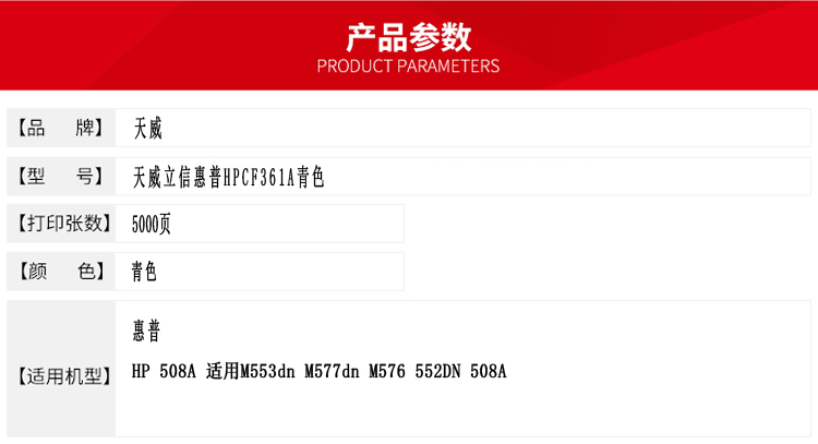 • 商品名稱:立信 CF361 硒鼓帶芯片天威立信裝(TFH342CYNJ) 5000頁 青色 適用于HP Color LaserJet Enterprise M552dn/M553n/M553dn/M553x; HP Color LaserJet Enterprise MFP 577c/MFP 577z/M577dn/MFP 577f