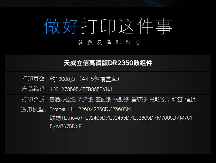 立信 DR2350 鼓組件天威立信裝(TFB365BYNJ) 12000頁 黑色 適用于Brother HL-2260/2260D/2560DN 聯(lián)想(Lenovo) LJ2405D/LJ2455D/LJ2605D/M7605D/M7615/M7675DXF