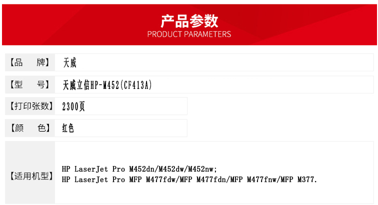 • 商品名稱:立信 CF413A 硒鼓帶芯片 天威立信裝(TFH091MYNJ) 2300頁 洋紅色 適用于HP LaserJet Pro M452dn/M452dw/M452nw; HP LaserJet Pro MFP M477fdw/MFP M477fdn/MFP M477fnw/MFP M377.