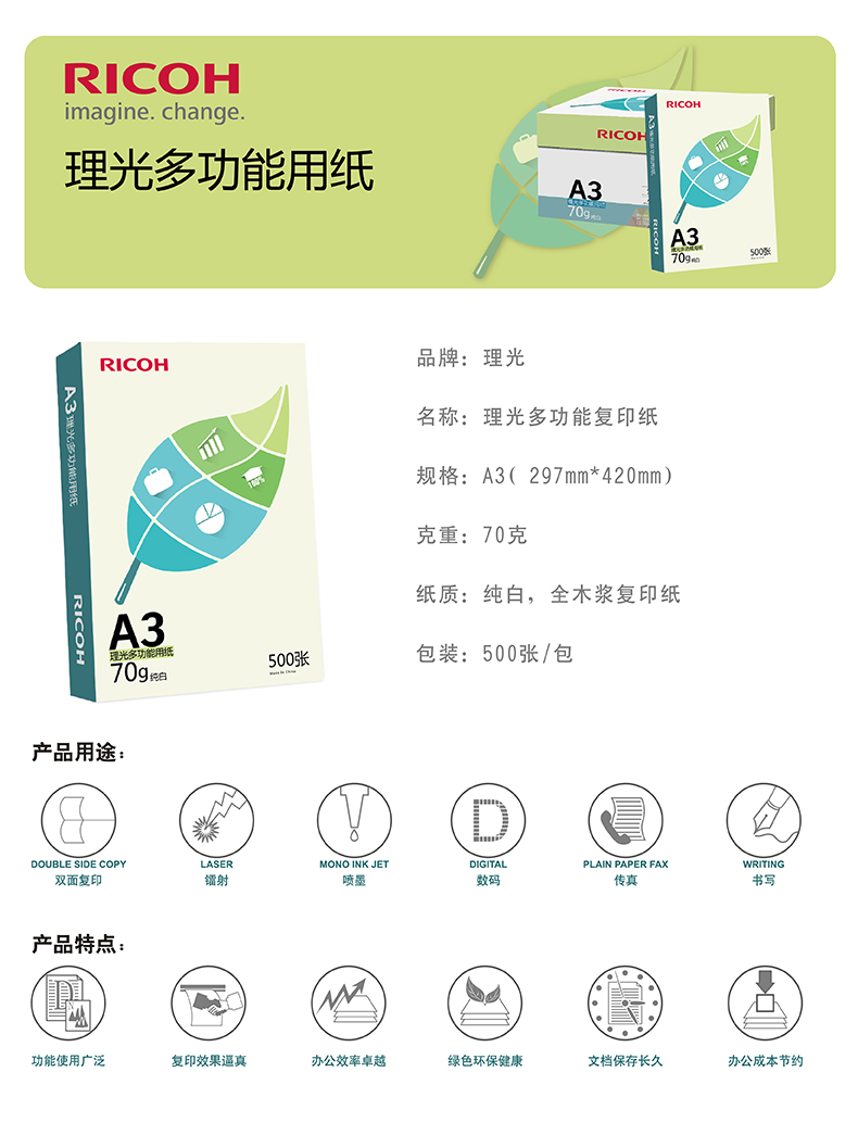 理光(Ricoh)70g A3 復(fù)印紙 多功能用紙 500張/包 4包1箱