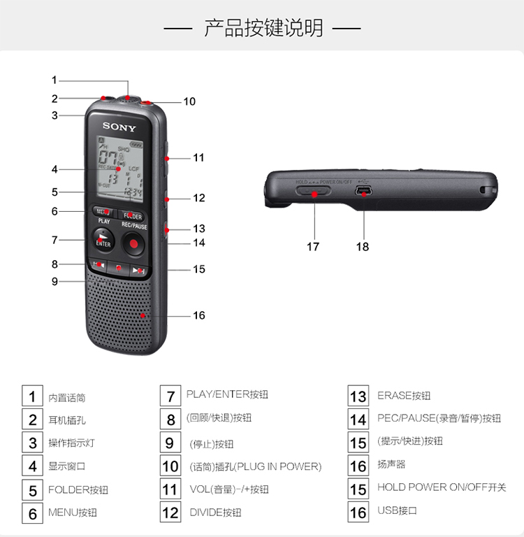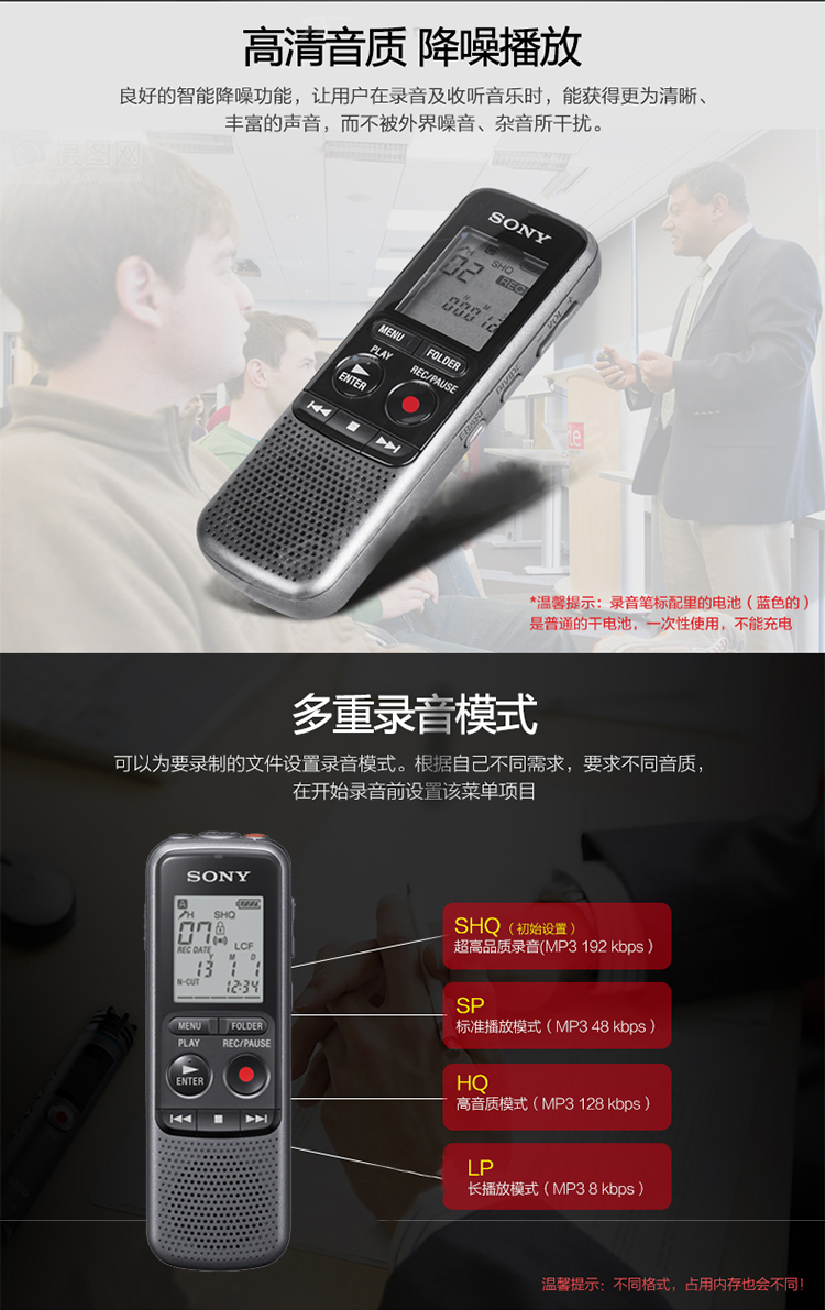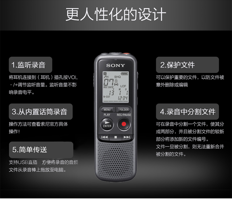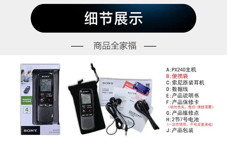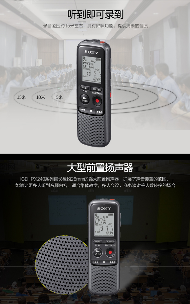 • 商品名稱:索尼(SONY)專業(yè)數(shù)碼錄音筆 ICD-PX240 4G 智能降噪可監(jiān)聽 支持音頻線轉(zhuǎn)錄 適用商務(wù)學(xué)習(xí)采訪