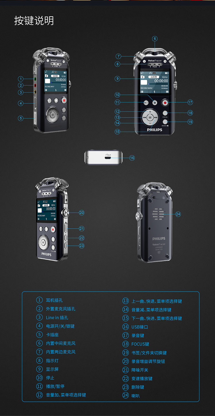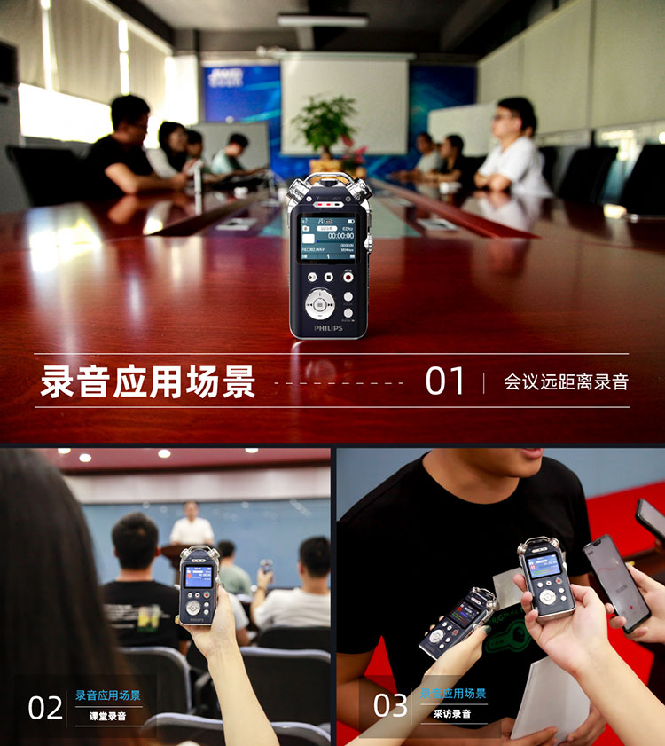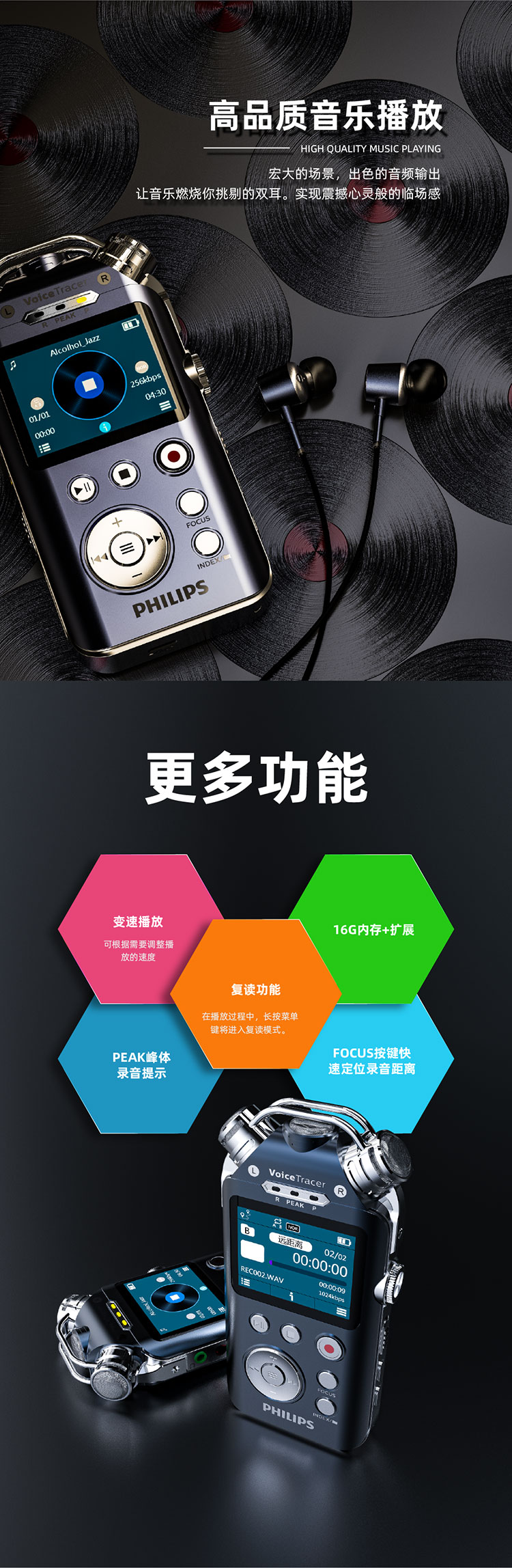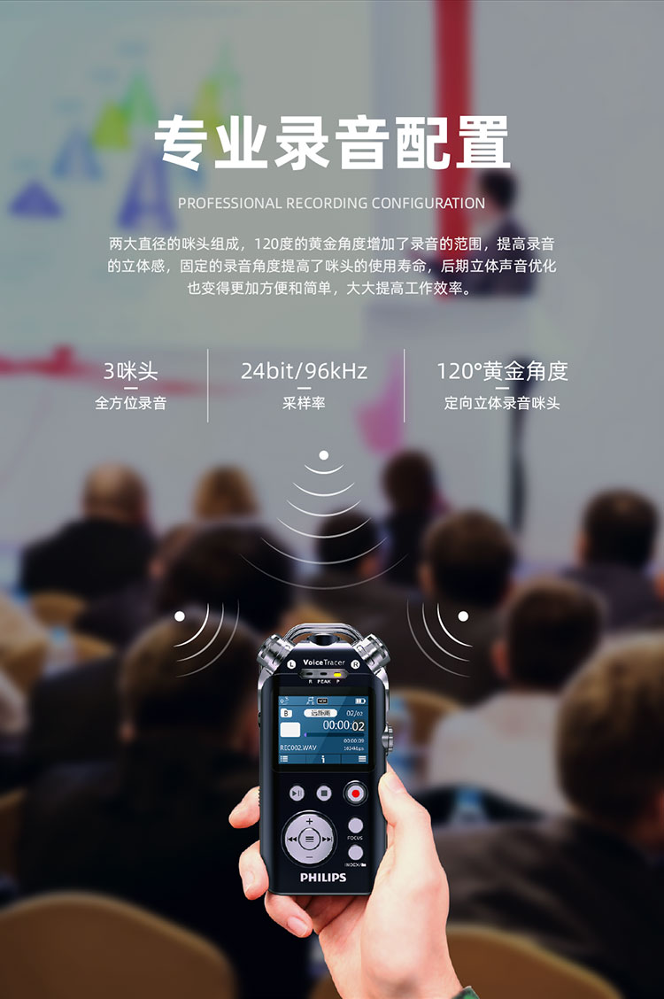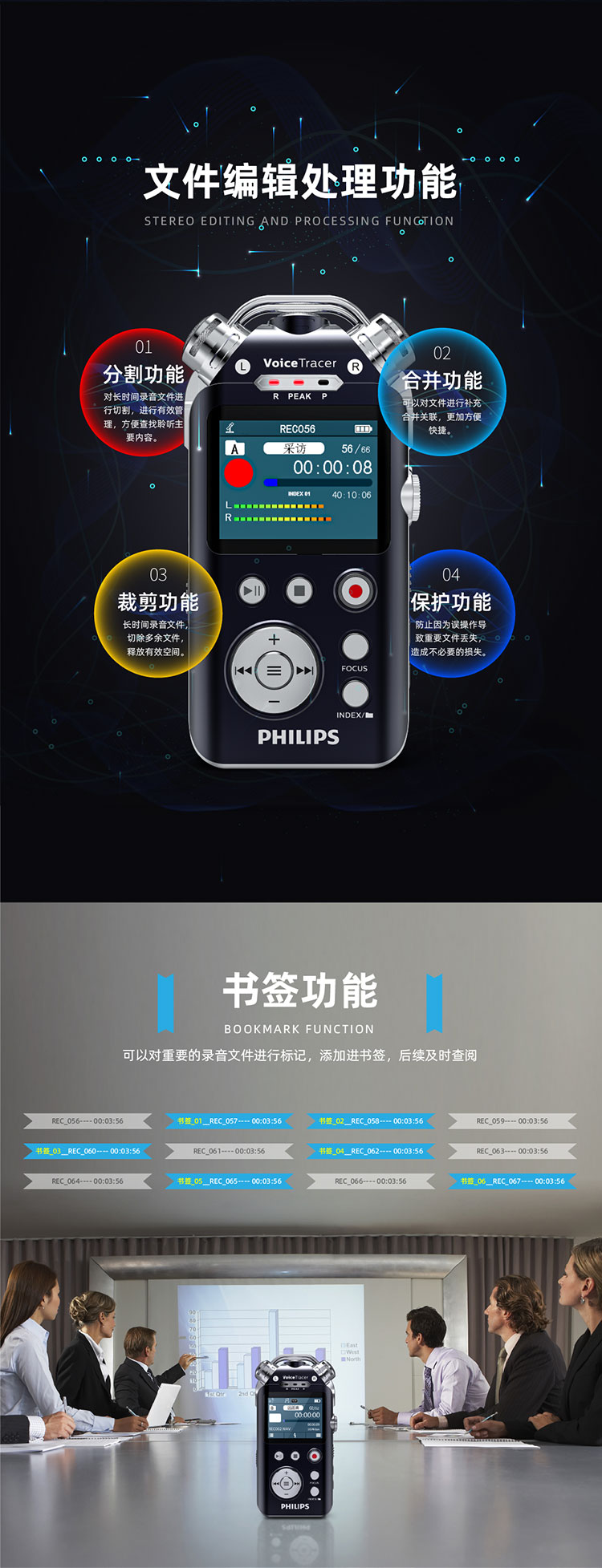 飛利浦(PHILIPS)VTR7800 16G 錄音筆 4通道高清降噪遠(yuǎn)距離錄音 文件編輯 變速播放