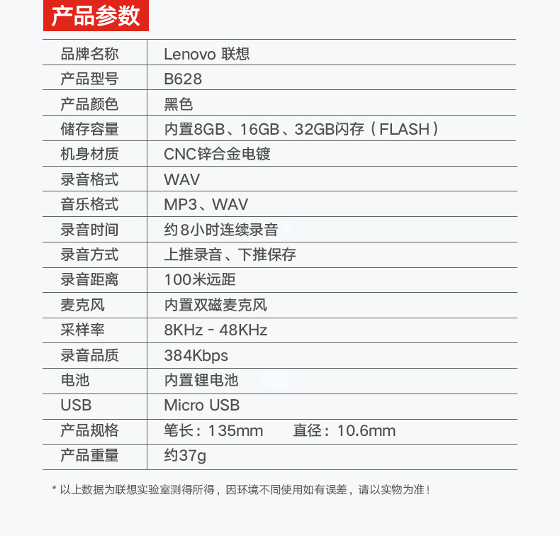 • 商品名稱:聯(lián)想(Lenovo)筆形錄音筆B628 16G智能專業(yè)微型高清遠距降噪便攜迷你 錄音器 學習培訓商務會議采訪
