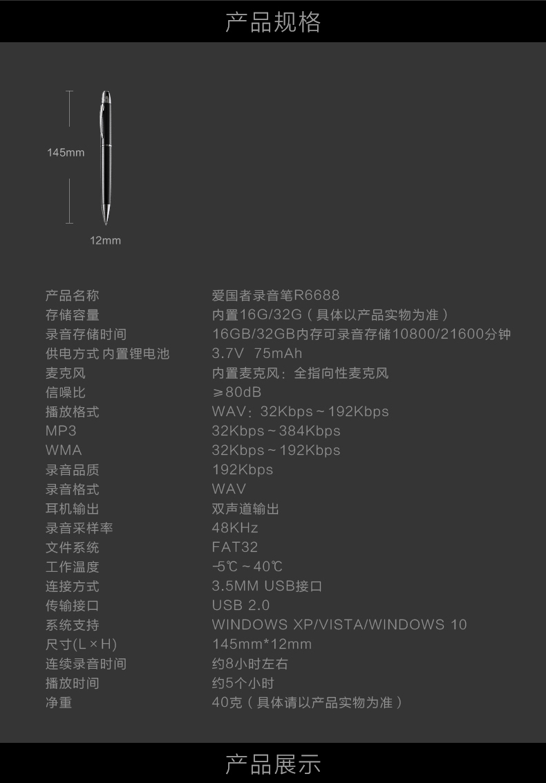 • 商品名稱:愛國者(aigo) 筆形錄音筆R6688 16G 智能專業(yè)微型高清遠距降噪 學習會議采訪微型錄音器