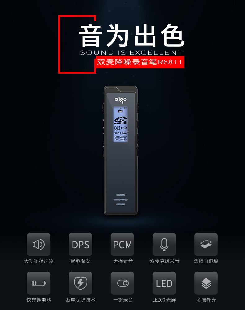 愛國者(aigo) 錄音筆 R6811 16G一鍵錄音擴(kuò)容智能專業(yè)微型高清降噪錄音器 學(xué)習(xí)會(huì)議培訓(xùn)采訪