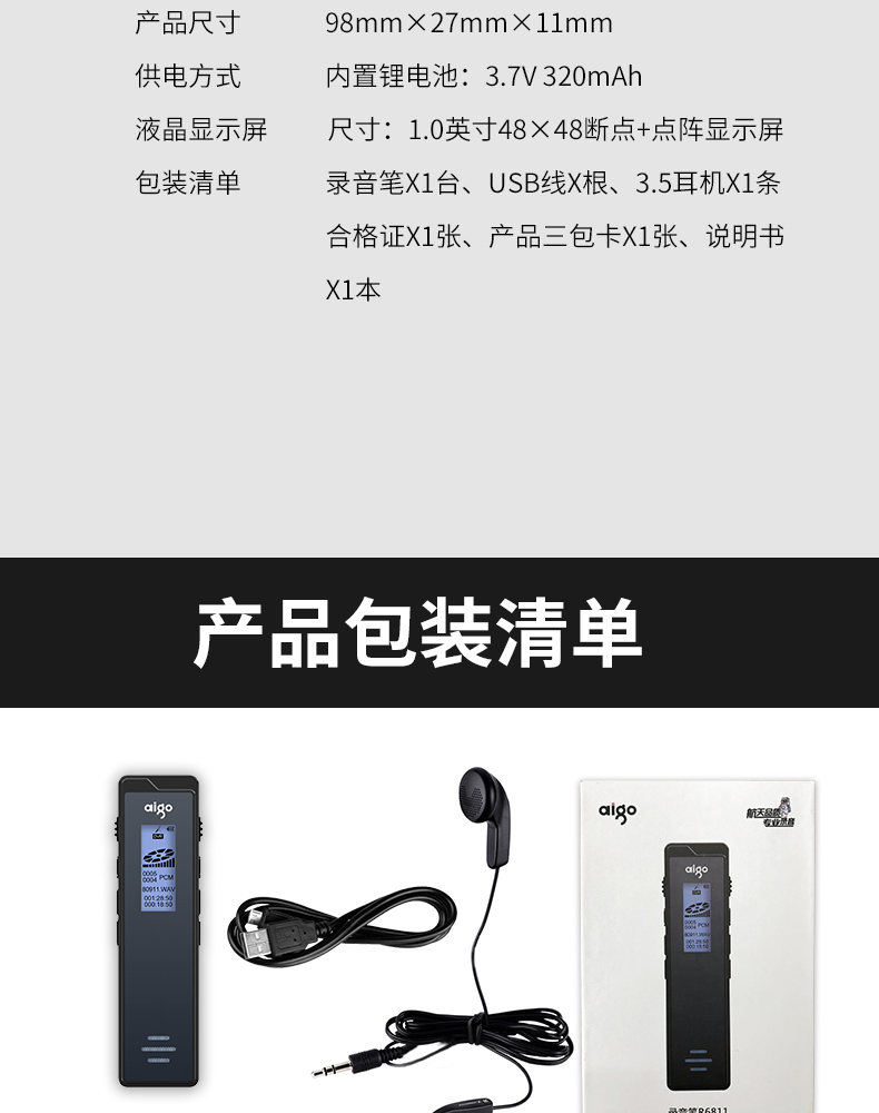 • 商品名稱:愛國者(aigo) 錄音筆 R6811 16G一鍵錄音擴(kuò)容智能專業(yè)微型高清降噪錄音器 學(xué)習(xí)會(huì)議培訓(xùn)采訪