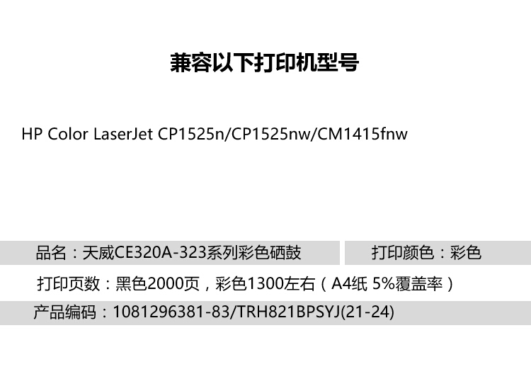 • 商品名稱(chēng):天威 CE322A 硒鼓帶芯片商用裝(TRH823YPSYJ) 1300頁(yè) 黃色 適用于HP Color LaserJet CP1525n/CP1525nw/CM1415fnw