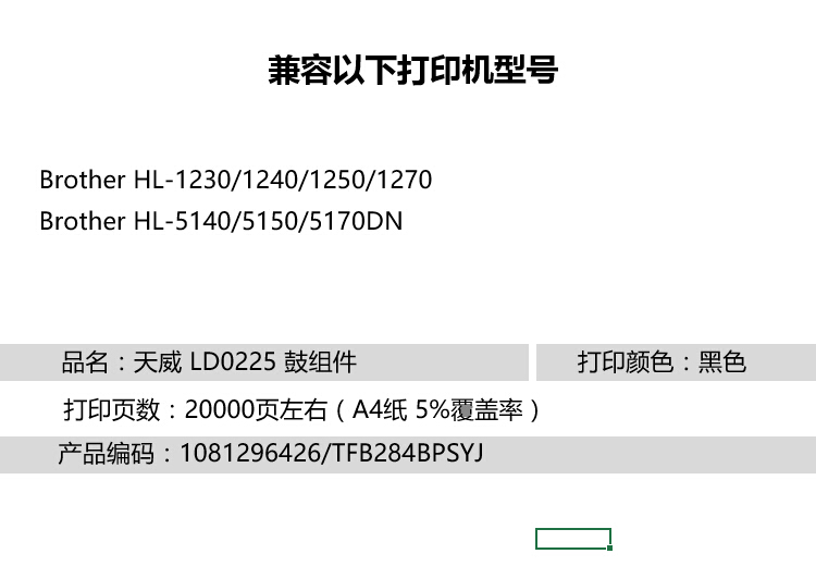 • 商品名稱:天威 LD0225 鼓組件商用裝(TFB284BPSYJ) 20000頁 黑色 適用于Brother HL-1230/1240/1250/1270 Brother HL-5140/5150/5170DN