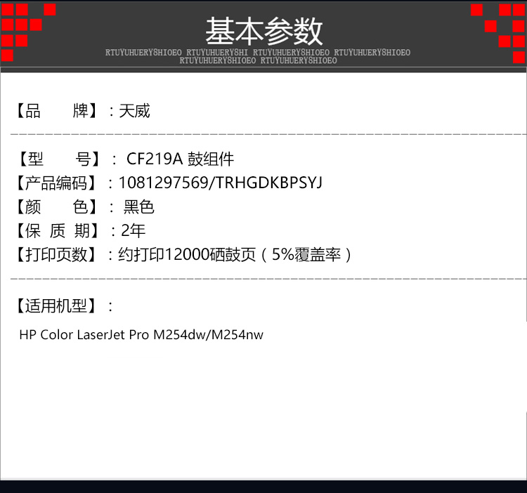 • 商品名稱:天威 CF219A 黑色鼓組件帶芯片商用裝 印量約12000頁