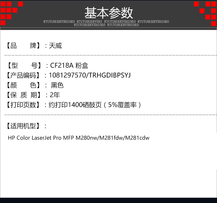 • 商品名稱:天威 CF218A 黑色粉盒帶芯片商用裝 印量約1400頁