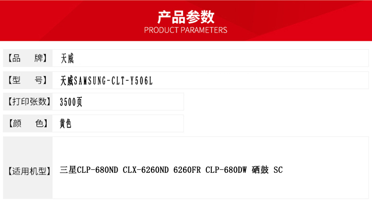 • 商品名稱:天威 CLT-Y506L 黃色硒鼓帶芯片專業(yè)裝 印量約3500頁