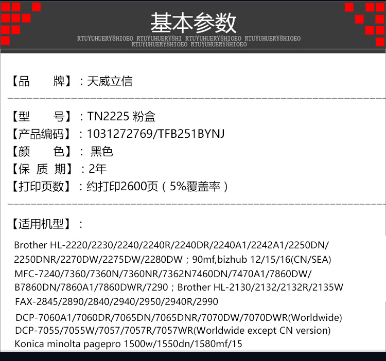 • 商品名稱:天威立信 TN2225(TFB251BYNJ) 黑色粉盒 印量約2600頁(yè)