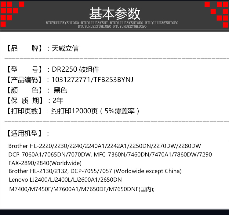 - 商品名稱:立信 DR2250 鼓組件天威立信裝(TFB253BYNJ) 12000頁 黑色 適用于Brother HL-2220/2230/2240/2240A1/2242A1/2250DN/2270DW/2280DW,DCP-7060A1/7065DN/7070DW, MFC-7360N/7460DN/7470A1/7860DW/7290 ,FAX-2890/2840(Worldwide), Brothe