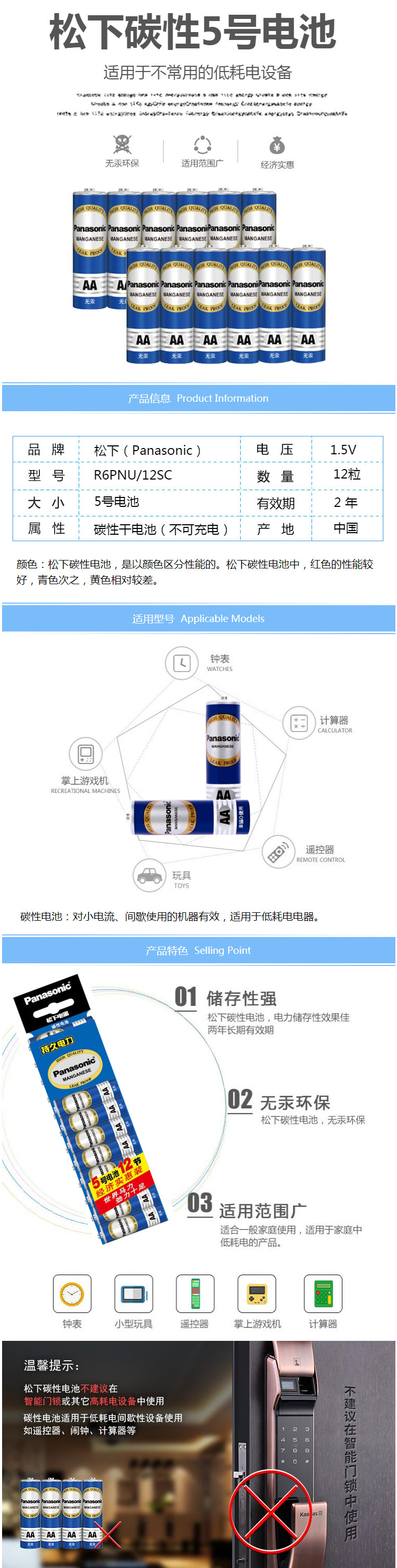 - 商品名稱:松下(Panasonic)碳性5號(hào)干電池 12節(jié) 適用于遙控器玩具萬(wàn)用表門鈴 R6PNU/12SC